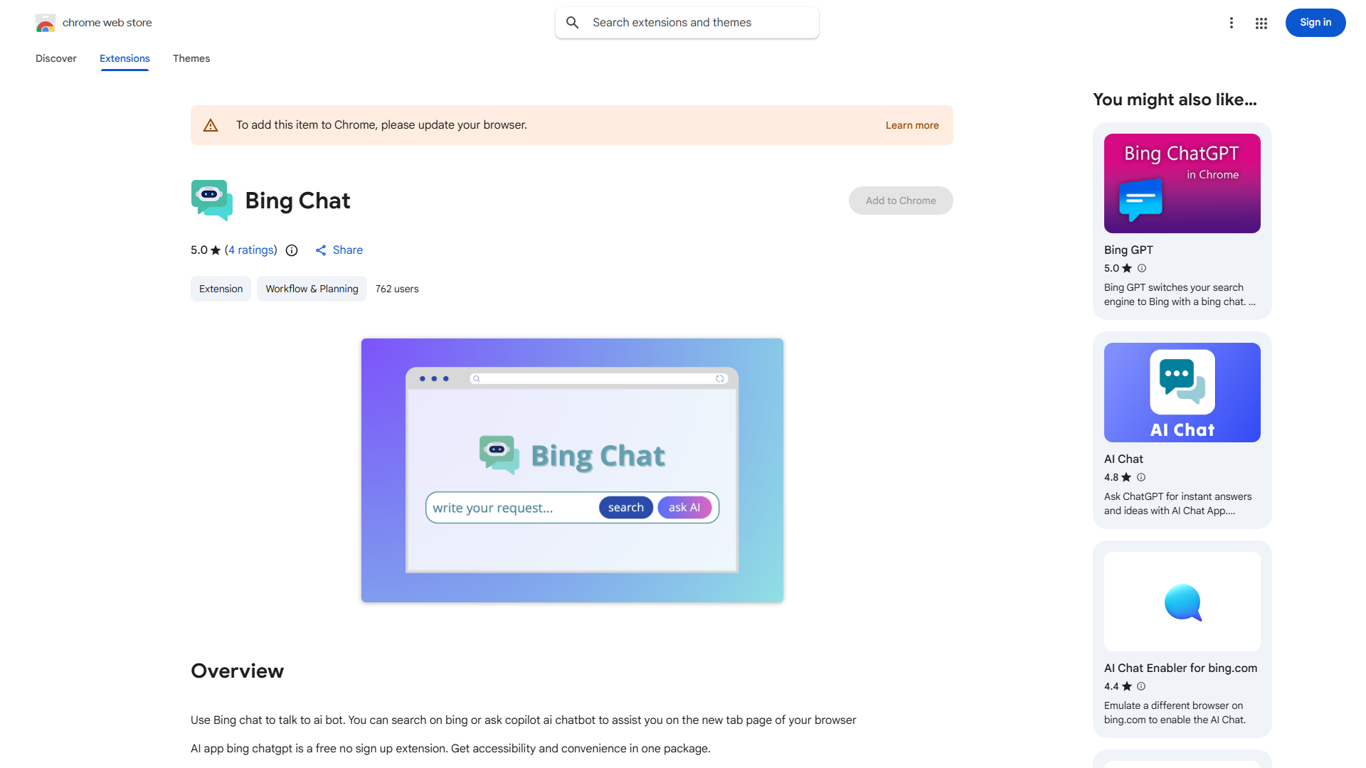Bing Chat GPT is a Chrome extension that provides free access to Copilot chatbot and Bing search. It integrates AI conversation with web search for enhanced browsing efficiency.