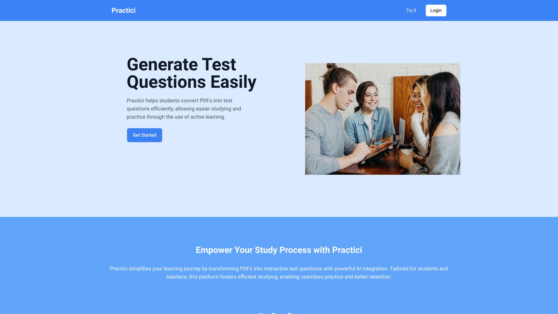 Practici is an AI-powered study tool transforming PDFs into interactive quizzes. It converts passive reading into active learning by generating personalized test questions to improve comprehension and retention.