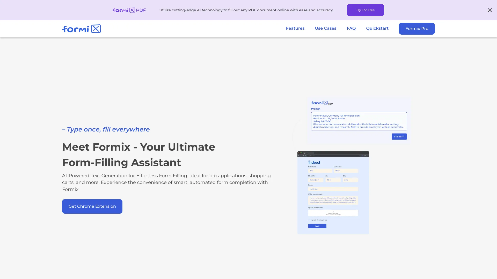Formix is an AI-powered form-filling assistant that automates data entry for online forms and PDF documents. It uses advanced artificial intelligence to understand form fields and auto-populate them with your secure profile information, saving time and ensuring accuracy.