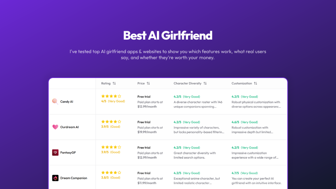 Best AI Girlfriend is a comparison platform featuring 30+ virtual companion apps. It helps users find their perfect AI match by evaluating each app across emotional depth, customization, NSFW content, conversation quality, and user satisfaction.