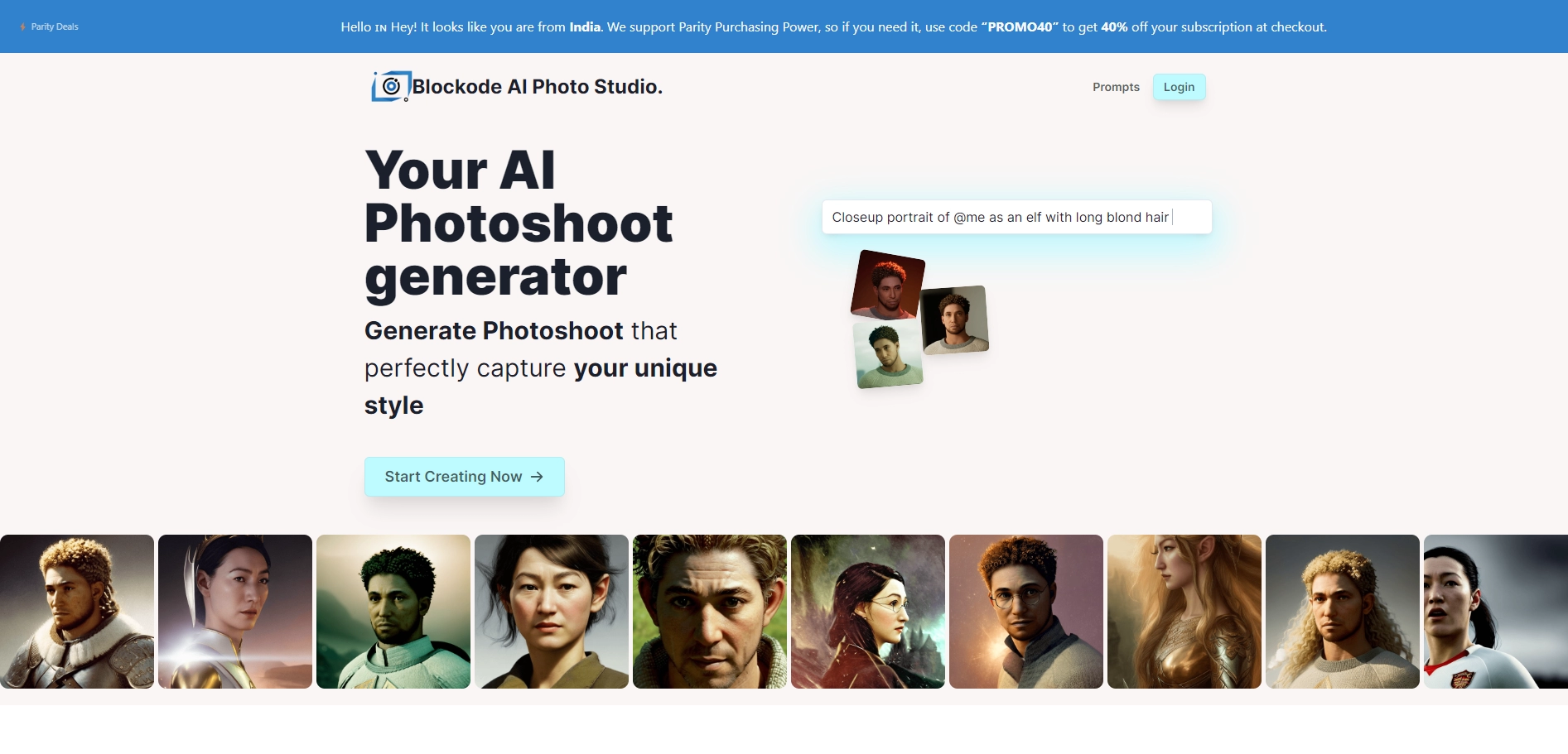 Blockode AI Photo Studio is a web-based platform that uses artificial intelligence to transform your selfies into professional-quality photos. Generate customized images for LinkedIn, social media, or marketing by uploading photos and providing text prompts.