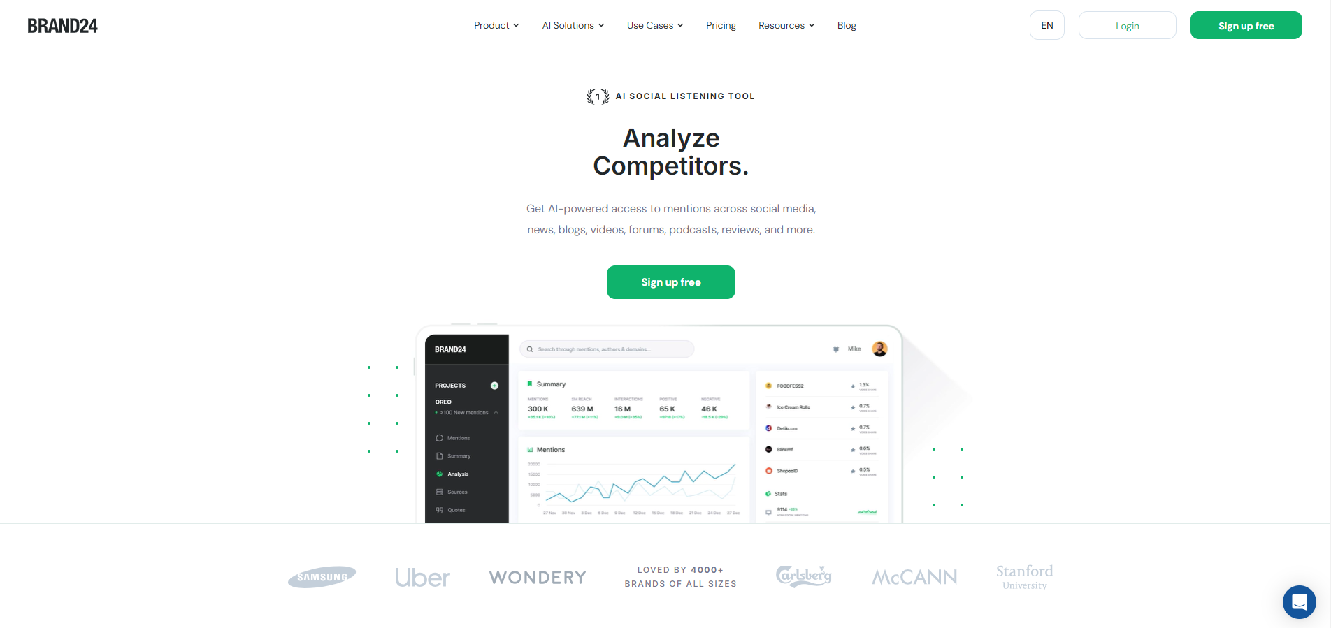 Brand24 offers real-time social media monitoring, sentiment analysis, competitor tracking, customizable alerts, and comprehensive analytics. Its AI-powered sentiment detection accurately categorizes mentions as positive, negative, or neutral.