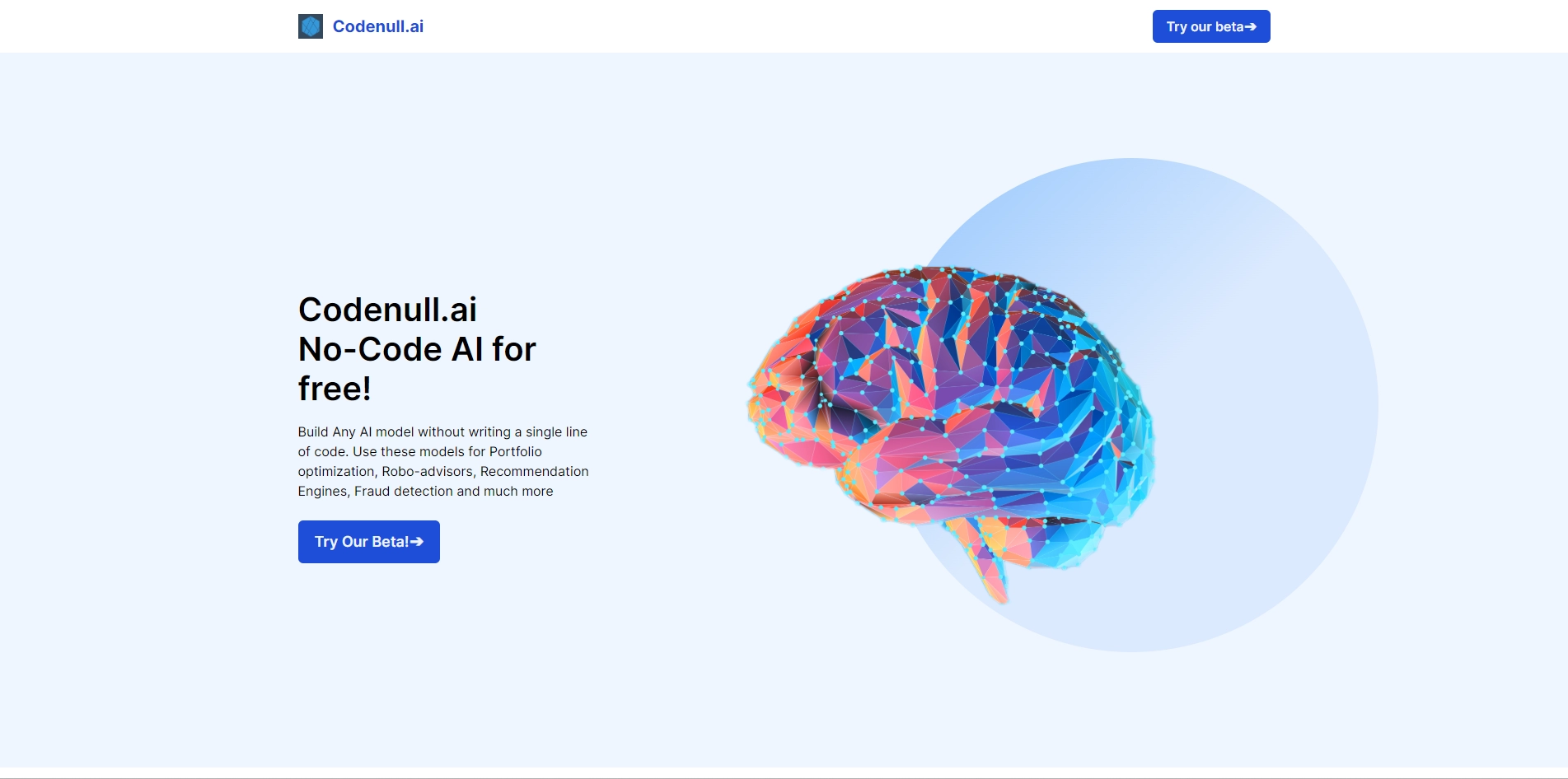 Codenull.ai democratizes artificial intelligence through an intuitive web app. Businesses and individuals create custom AI models without coding by uploading CSV data to train ML models for accurate predictions.