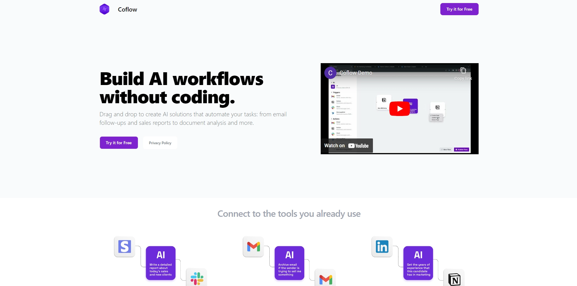 Coflow is an AI-powered no-code workflow automation platform designed to streamline business operations. It enables professionals to automate repetitive tasks without technical expertise through an intuitive drag-and-drop interface.