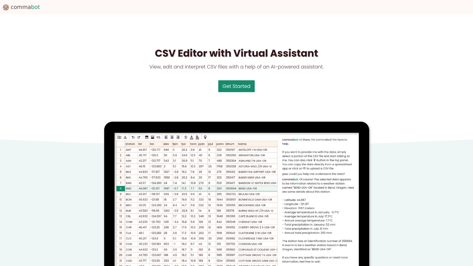 Commabot is an innovative online CSV editor designed to simplify the process of viewing, editing, and interpreting CSV files. With its AI-powered assistant, it offers a seamless experience for users looking to manage and analyze their data efficiently. Whether you're a data analyst, a small business owner, or a student, Commabot is your go-to tool for handling CSV files with ease. Its user-friendly interface and powerful features make it an essential asset for anyone dealing with data management and analysis.