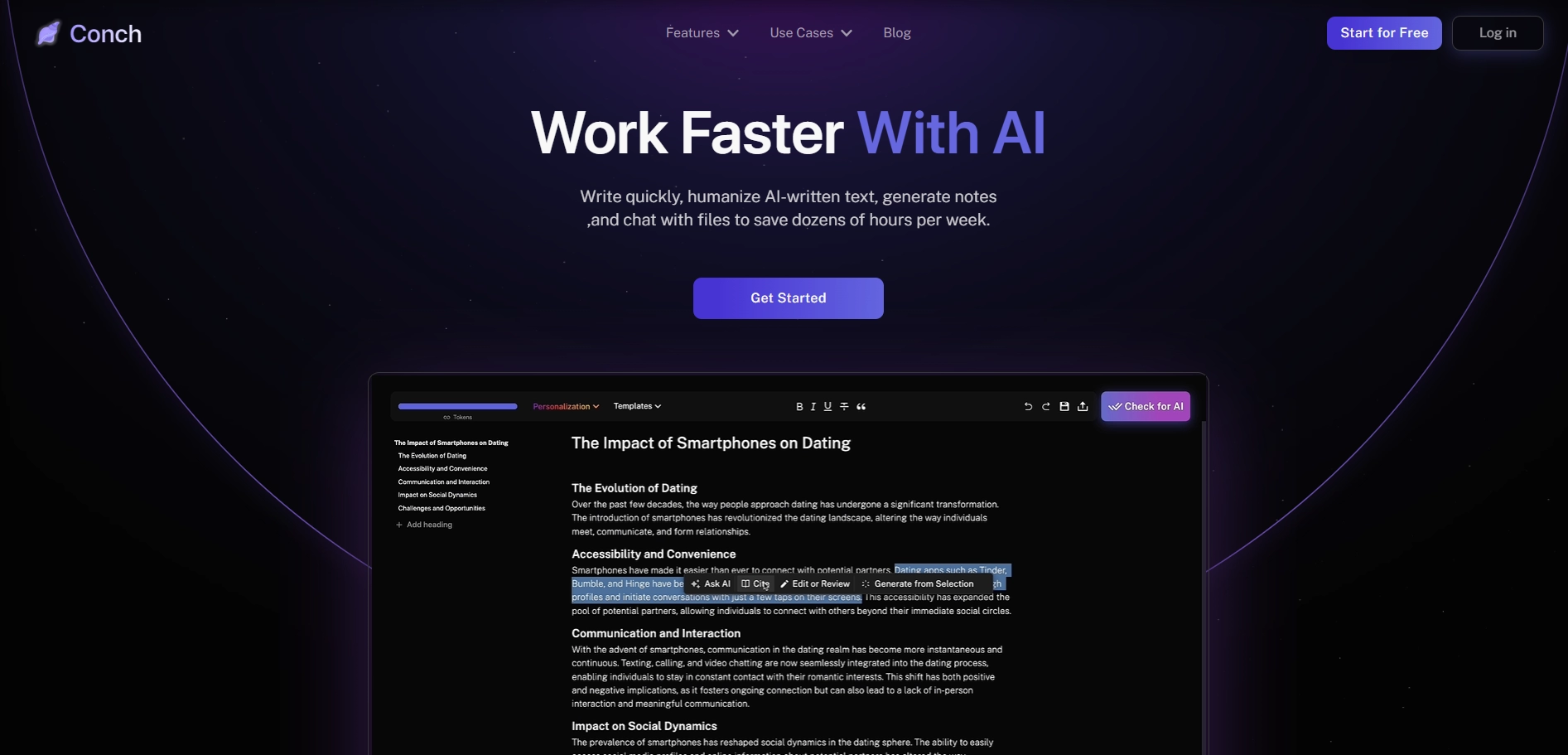 Conch is an AI-powered essay writing assistant that revolutionizes academic writing for students. It guides users through every stage of essay creation, ensuring polished, original content that meets academic standards.
