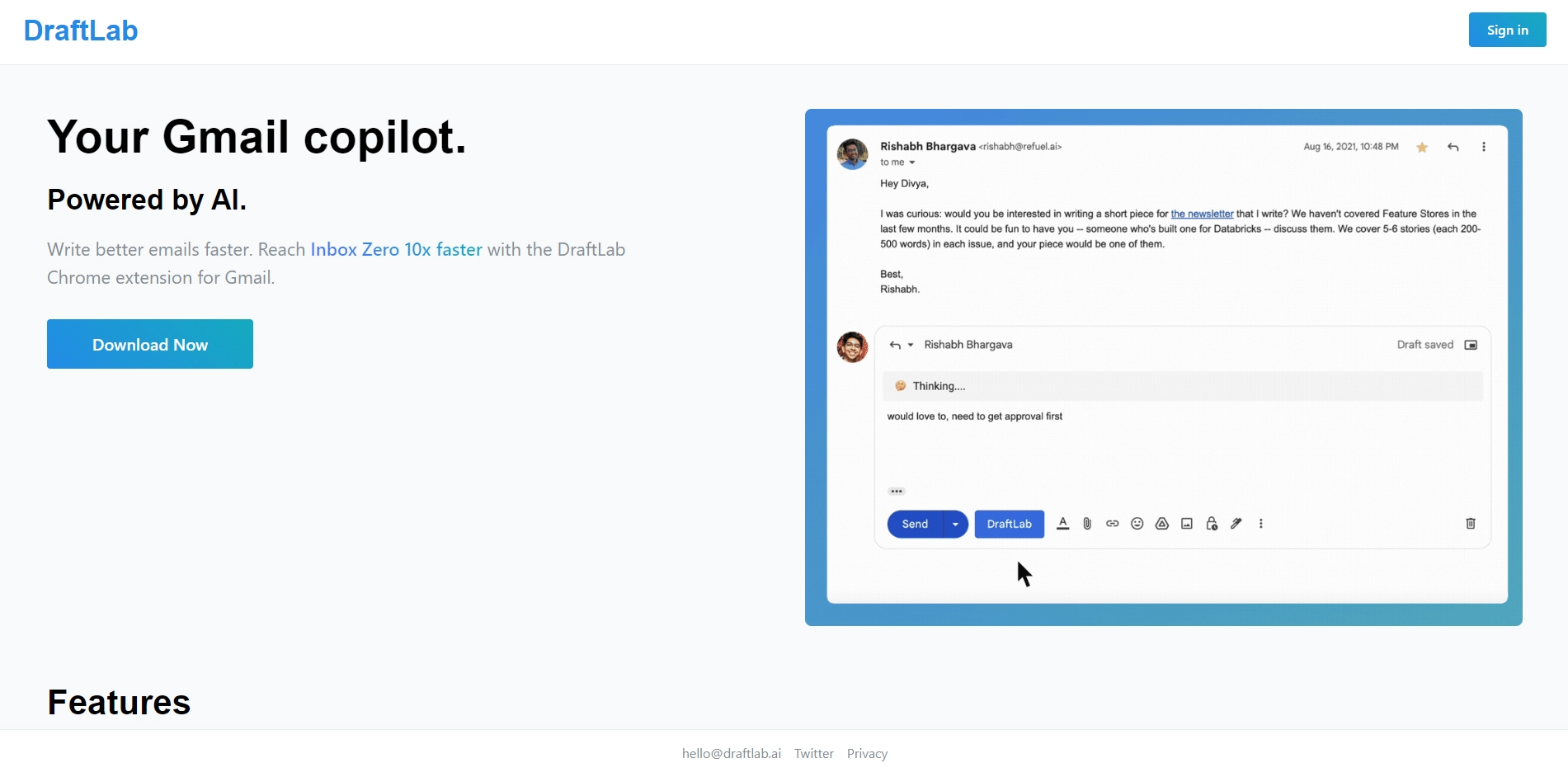 DraftLab is a groundbreaking Chrome extension that transforms email communication. It integrates with Gmail and leverages AI to generate high-quality replies in seconds, streamlining your workflow and enhancing productivity.