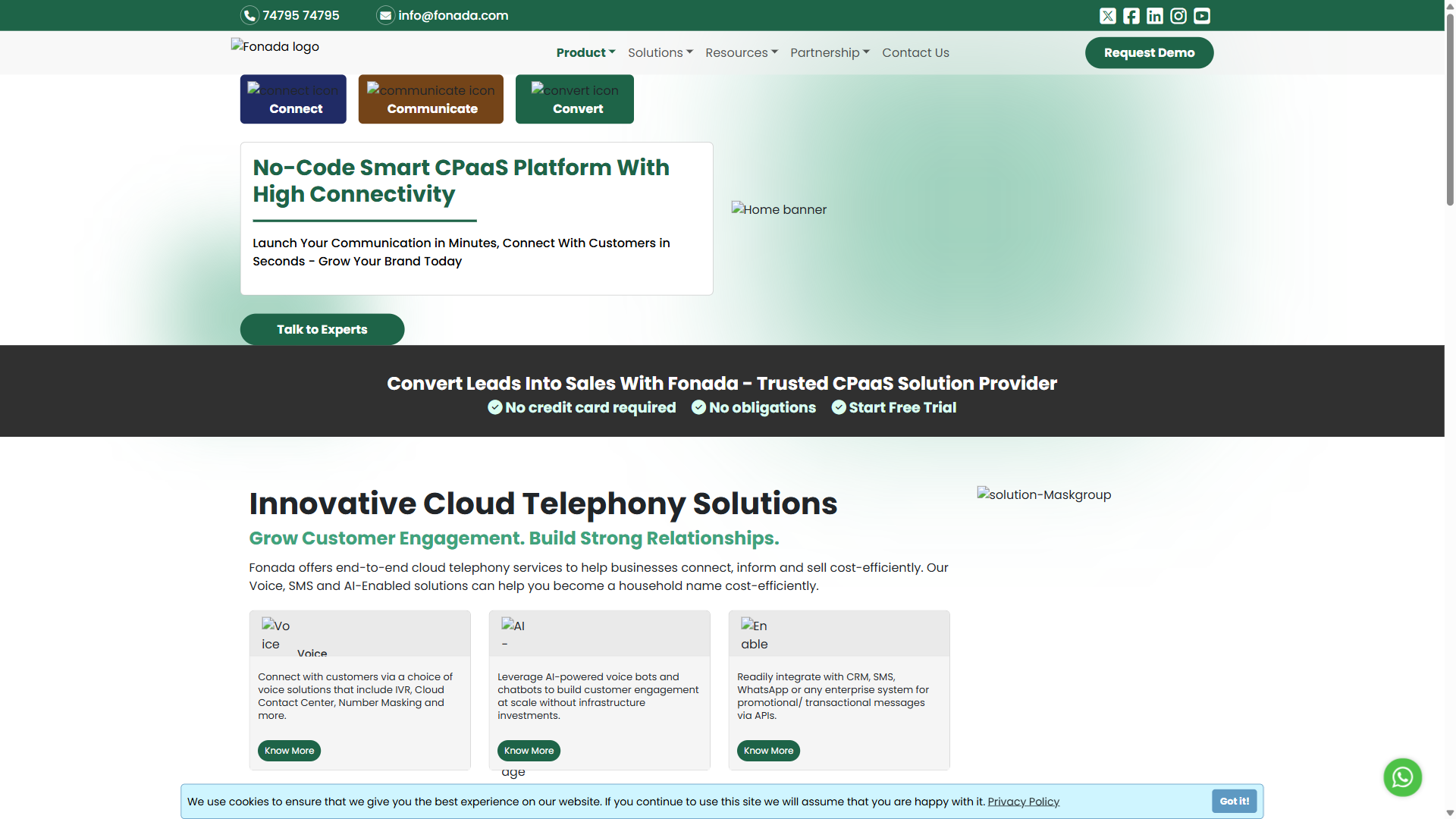 Fonada is a CPaaS provider integrating cloud telephony, SMS, and AI to streamline business communication and enhance customer engagement. It offers tools like automated call routing and personalized messaging for sales, support, and marketing.