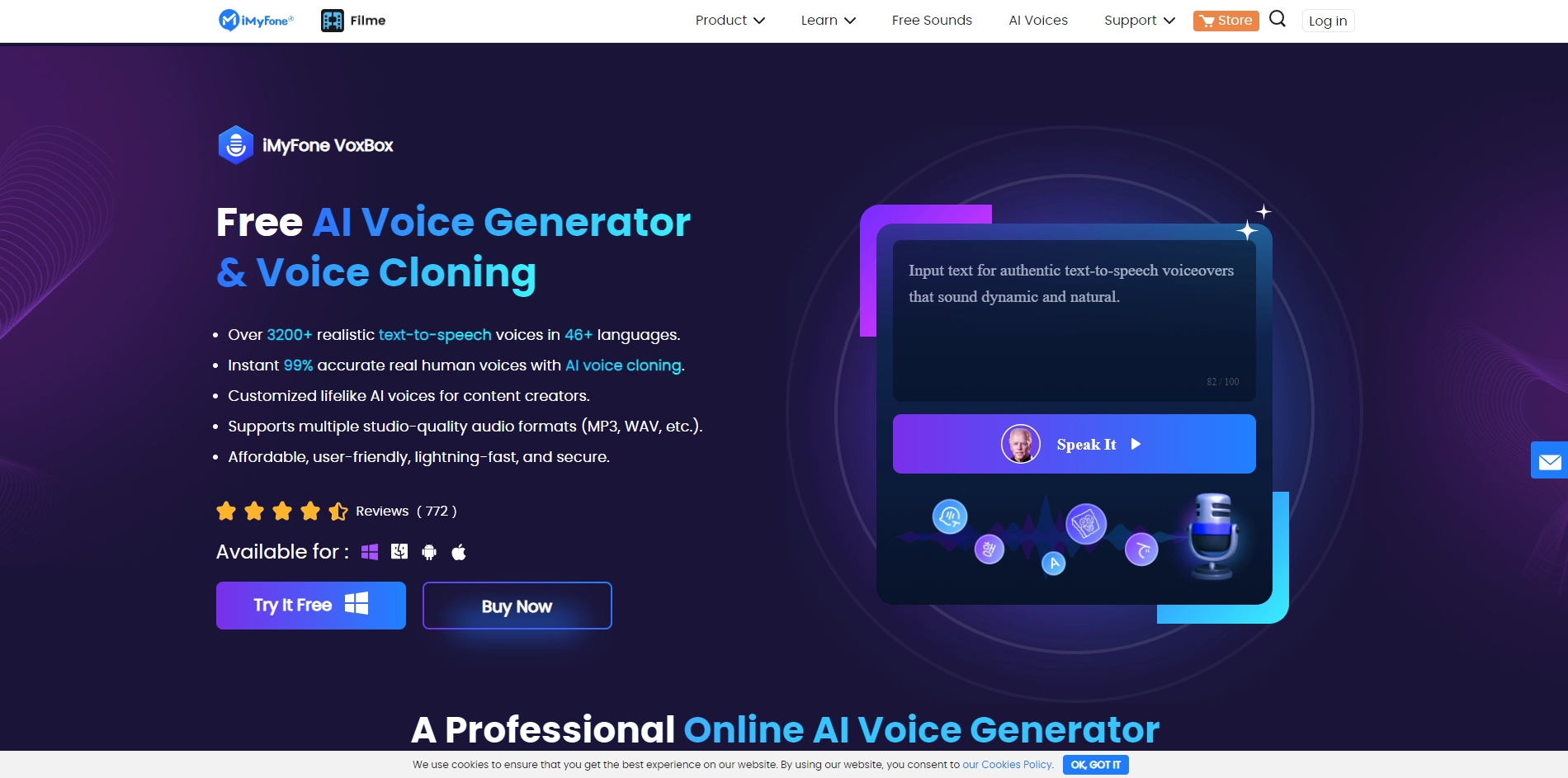 iMyFone VoxBox is an AI-powered voice generation and cloning platform that transforms text into natural-sounding speech. It supports 46+ languages with 3200+ realistic AI voices, enabling professional-quality voiceovers without expensive equipment or voice artists.