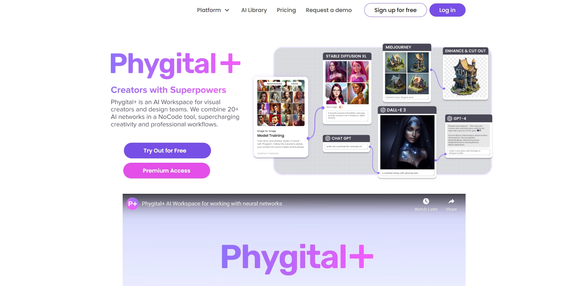 Phygital+ is an AI-powered web platform enabling creators, designers, and businesses to leverage artificial intelligence for visual content creation. Generate stunning images, transform videos, and create intricate 3D models with remarkable ease.