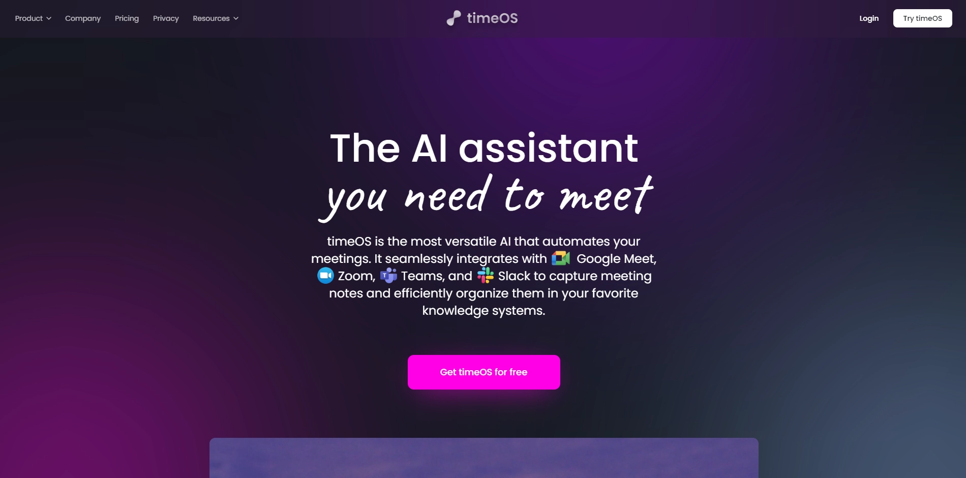 timeOS is an AI-powered time management solution that transforms how professionals organize schedules and meetings. It integrates with browsers, communication platforms, and productivity tools to create a unified productivity ecosystem.
