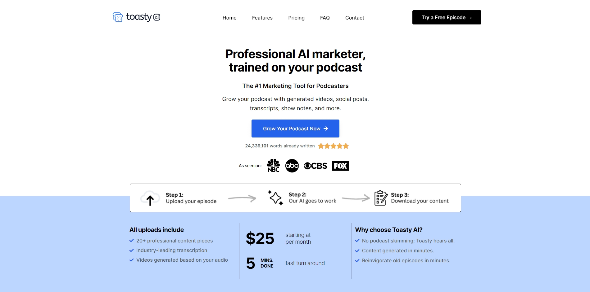 ToastyAI is an AI-powered podcast content platform that transforms audio episodes into marketing materials. It automatically generates transcripts, show notes, blog articles, social media posts, and more from podcast audio files, eliminating hours of manual work for podcasters.