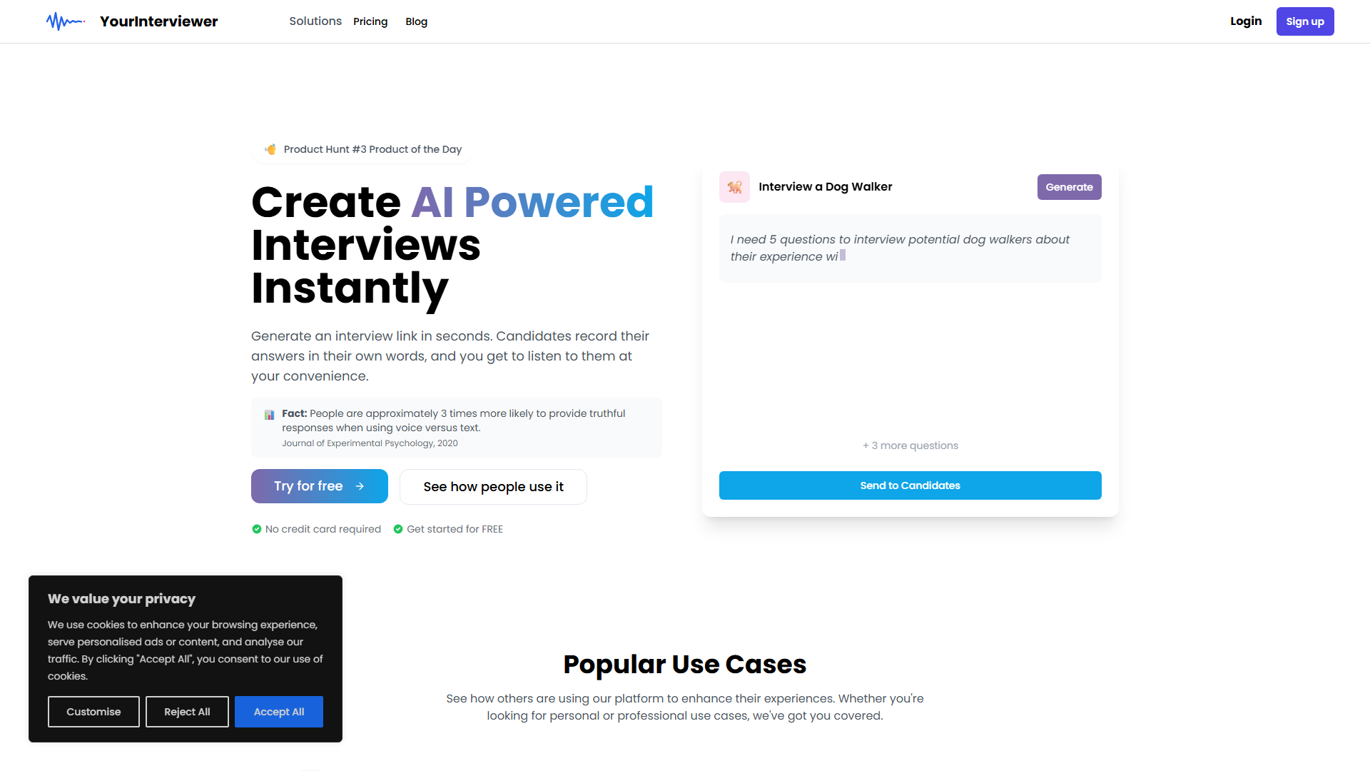 YourInterviewer is an AI-powered interview platform that transforms voice recordings into professional written content. Designed for journalists, content creators, and researchers, it streamlines the process of converting interviews into articles, blog posts, and other written formats with remarkable accuracy.